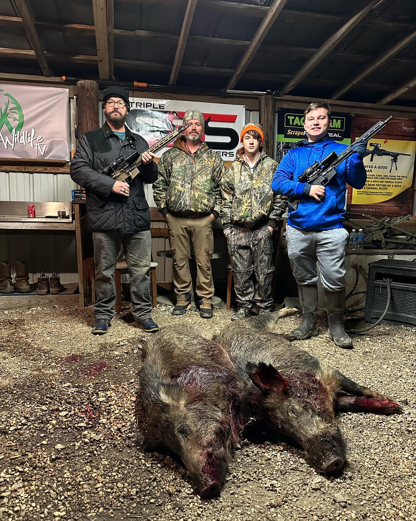 Our hunts typically take place about an hour before sunset until you get your opportunity. We’ll start with a briefing at our hunting lodge. We will discuss stands, scopes, guns, and what to do after you take your shot. Normally we start out still hunting in nice dry box blinds and then depending on the activity and movement we transition over to spot and stalk. We completely leave the decision up to you when it comes to how long you sit but we can assure you that all bait piles and feeders are monitored consistently each day. The stand we choose for you will have been thoughtfully and strategically placed, thinking about your shot opportunity for the night. Sometimes this may happen early in the evening or early the next morning. The hogs we hunt are completely fair chase and wild. We cannot guarantee anything. Our job is to put you in position to take the shot, the rest is up to you! If the still hunting is unsuccessful after a few hours of waiting then we’ll put your skills to the test in our spot and stalk method. We use all cellular cameras to keep us posted on movement throughout the night. We monitor not only the hog movement but the amount of food that is left under feeders so we can carefully execute the next plan.